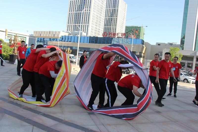 “協(xié)作過(guò)河”每隊(duì)5人六塊磚,從出發(fā)點(diǎn)到最后一名過(guò)河完畢,任何人腳不能落地,直至最后一個(gè)人一塊磚到達(dá)終點(diǎn)。這項(xiàng)比賽不僅需要合理安排好隊(duì)形,保持穩(wěn)定,還要講究遞磚的方法,以便節(jié)省時(shí)間。最終商業(yè)公司獲得了該項(xiàng)目的冠軍,天華公司和遼陽(yáng)公司取得第二、三名。