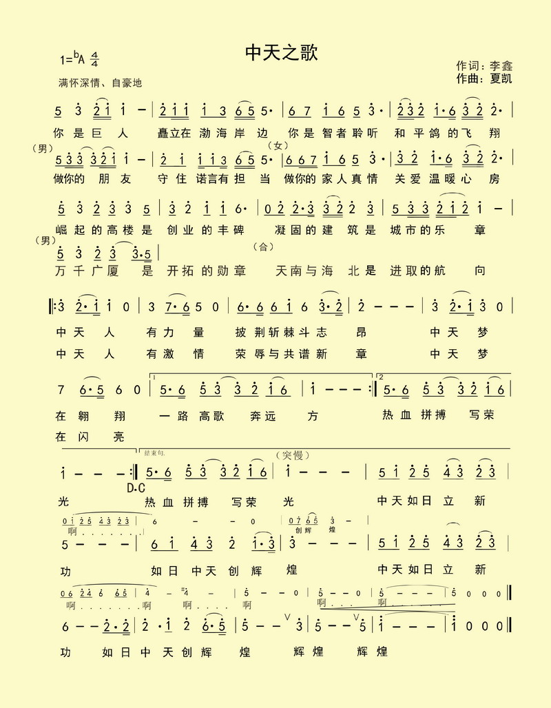 為了弘揚(yáng)中天精神,鼓舞中天人意氣風(fēng)發(fā)的斗志,集團(tuán)在紀(jì)念二十周年活動(dòng)中,創(chuàng)造了企業(yè)主題歌《中天之歌》,用歌聲迎接二十周年慶典?!吨刑熘琛酚杉瘓F(tuán)總裁辦公室主管李鑫寫(xiě)詞,夏凱譜曲,以優(yōu)美的旋律表達(dá)中天人的心聲。你是巨人,矗立在渤海岸邊,你是智者聆聽(tīng)和平鴿的飛翔,崛起的高樓是創(chuàng)業(yè)的豐碑,凝固的建筑是城市的樂(lè)章。做你的朋友,守住諾言有擔(dān)當(dāng),做你的家人,真情關(guān)愛(ài)溫暖心房,萬(wàn)千廣廈是開(kāi)拓的勛章,天南與海北是進(jìn)取的航向。中天人有力量,披荊斬棘斗志昂,中天夢(mèng)在翱翔,一路高歌奔遠(yuǎn)方,中天人有激情,榮辱與共譜新章,中天夢(mèng),在閃亮,熱血拼搏寫(xiě)榮光。中天如日立新功,如日中天創(chuàng)輝煌。