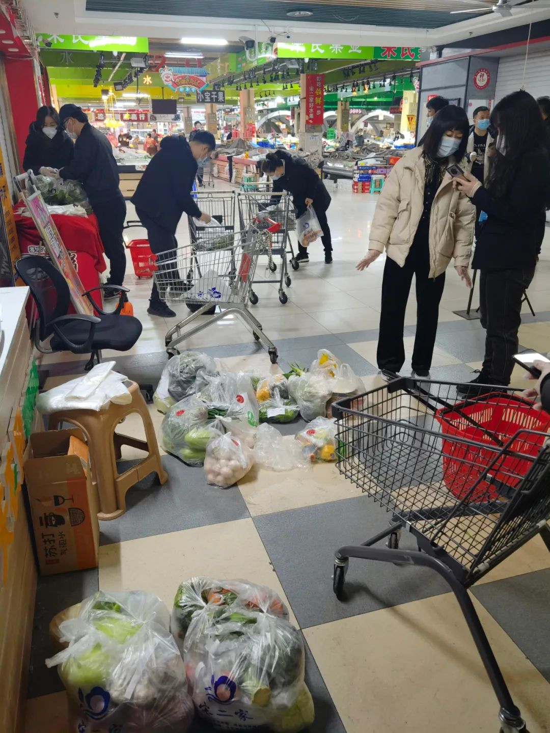 隨著疫情管控的發(fā)展,“中天農(nóng)貿(mào)市場”線上小程序訂單量飆升,每天增加到200多單,每一單貨物少則幾個物品,多則十幾種甚至二十幾種菜品,大家需要到各個攤位上分揀菜品,再經(jīng)過商戶的過秤,才能裝好袋子配送。因?yàn)槠奉惒煌S家不同、是否有貨物等關(guān)系,選購的過程中需要不斷地與訂單客戶電話溝通,每一次溝通都需要有足夠的耐心和解釋。3月18日,一個訂單留錯了電話號碼,分店經(jīng)理東巨峰頂著“騷擾電話”的罵名,尋找了二個多小時,才找到買家。