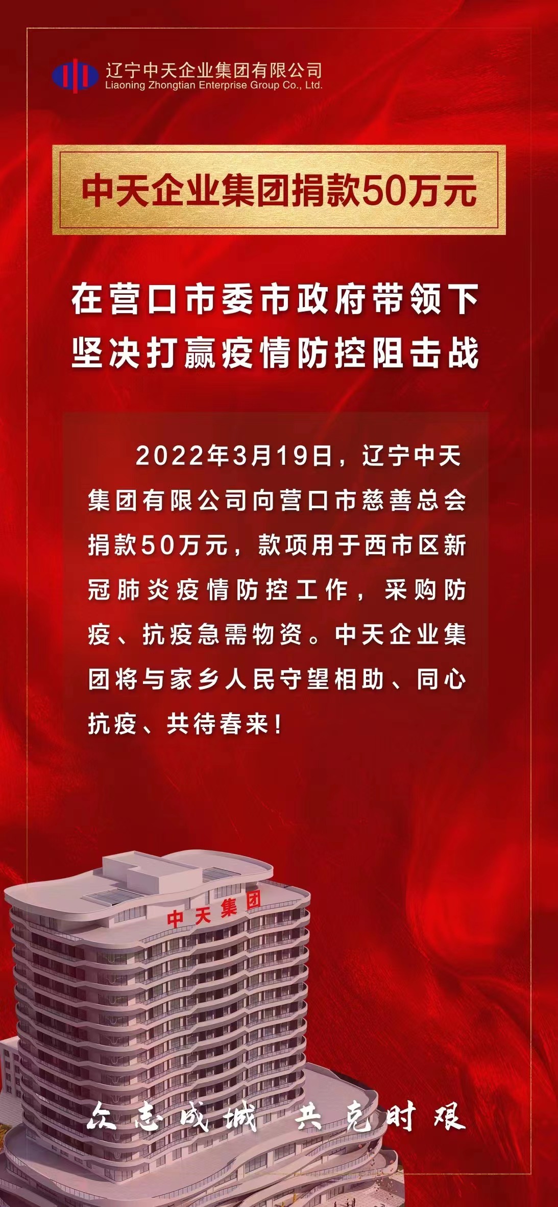 2022年3月19日,遼寧中天集團(tuán)有限公司向營(yíng)口市慈善總會(huì)捐款50萬(wàn)元,款項(xiàng)用于西市區(qū)新冠肺炎疫情防控工作,采購(gòu)防疫、抗疫急需物資。中天企業(yè)集團(tuán)將與家鄉(xiāng)人民守望相助、同心抗疫、共待春來(lái)!
