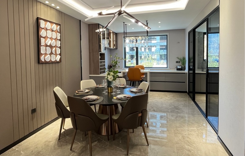 公區(qū)空間開放設計貫穿始終,從視覺和使用體驗上,滿足改善型家庭對照顧家人、招待親友的多場景要求。廚房與餐廳之間形成一體,無需再來回走動,縮短了家務動線,且打通之后彼此沒有間隔,即使是在客廳,也能與廚房里的家人進行互動。同時去掉墻體占用的面積,不僅是視覺上變大了,整體使用空間也變大了,以此為基礎增加收納、櫥柜、桌面等設計,能在空間上實現(xiàn)最大化利用。