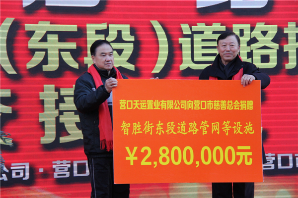 2016年12月10日,由中天集團(tuán)投資捐建的營(yíng)口市智勝街開(kāi)通捐贈(zèng)交接儀式華彩啟幕,標(biāo)志著這條長(zhǎng)400余米,寬15米,總投資280萬(wàn)元的公共道路正式開(kāi)通,疏通了營(yíng)口市城南板塊的交通,方便了附近小區(qū)居民的出行。營(yíng)口市政府副市長(zhǎng)董永安、營(yíng)口慈善總會(huì)副會(huì)長(zhǎng)郭慶嘉、中天集團(tuán)于寶權(quán)董事長(zhǎng)等領(lǐng)導(dǎo)與2000多位市民共同見(jiàn)證了中天集團(tuán)慈善義舉,修路善行,造福一方。