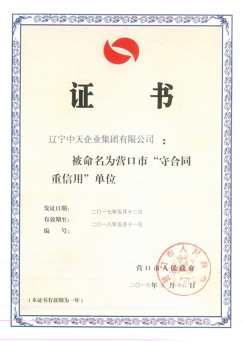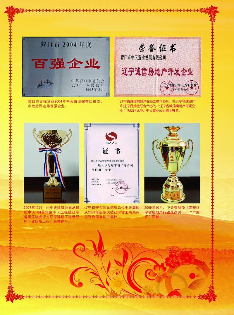 中天集團連續(xù)十三載榮獲“市守合同重信用”企業(yè)榮譽稱號?!罢\實守信”是一個企業(yè)在激烈的市場競爭中保持旺盛生命力和競爭力的根本,是建立市場經(jīng)濟秩序的基石,是企業(yè)可持續(xù)長遠穩(wěn)健發(fā)展的保障。中天集團成立至今,已建立起自身獨特的“誠信機制”,對業(yè)主說到做到,對客戶說到做到,與主管政府部門領導說到做到,嚴格按合同履行各項責任與義務,“共贏互利、信守承諾”得到了社會各界的一致認可與好評,集團也走出了屬于中天特色的發(fā)展之路。